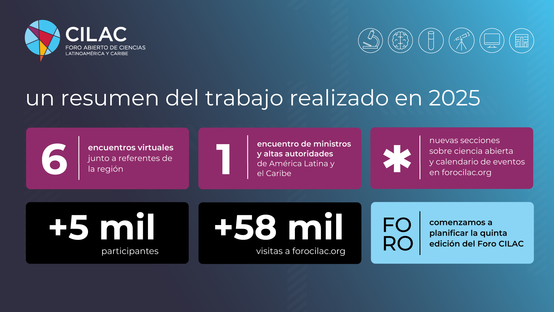 La plataforma web obtuvo un crecimiento crecimiento notable, con más de 58.000 visitas a forumcilac.org. Además, el sitio web se actualizó con nuevas secciones dedicadas a la ciencia abierta y un calendario de eventos, convirtiéndolo en un hub más completo para la información y el seguimiento de la actividad científica regional.
